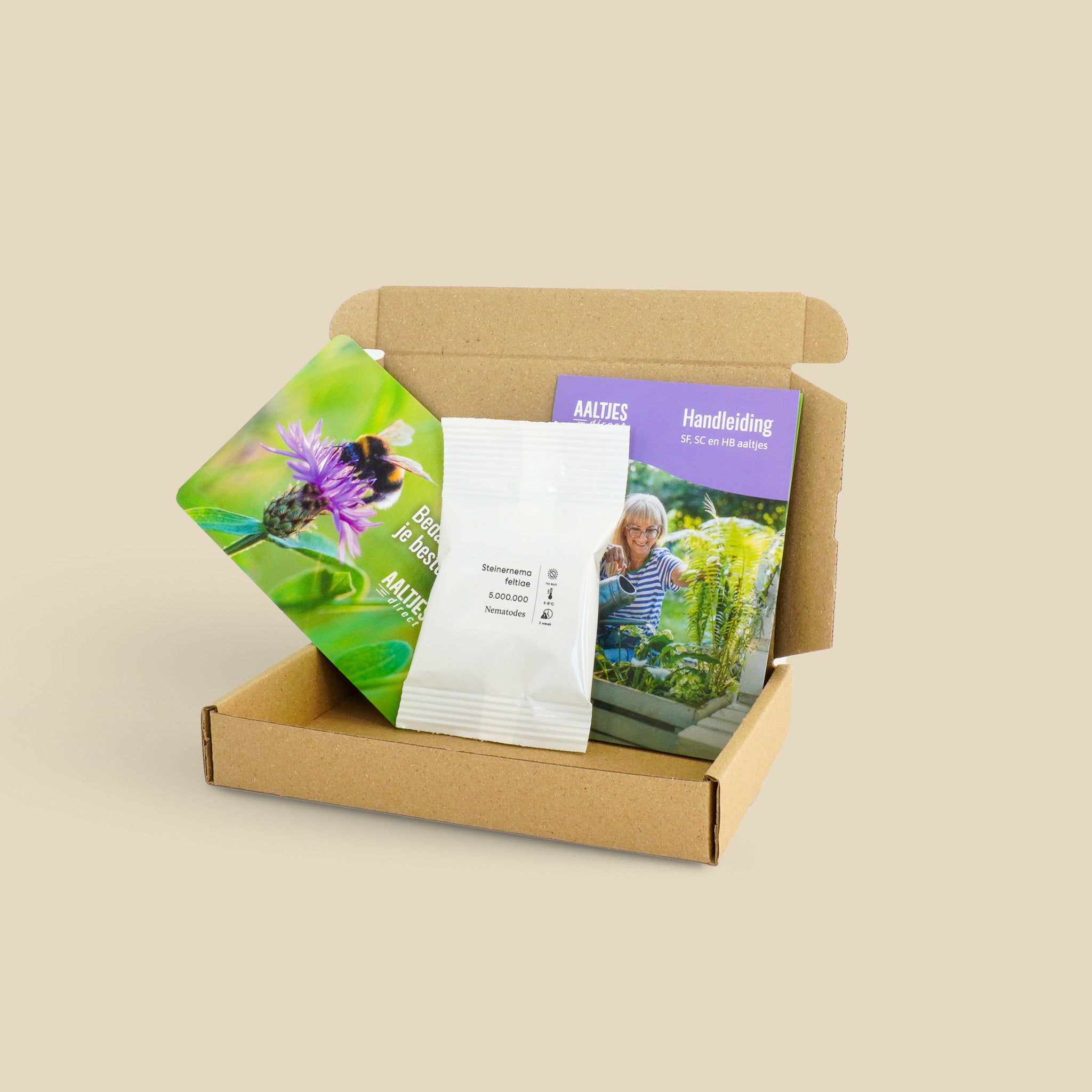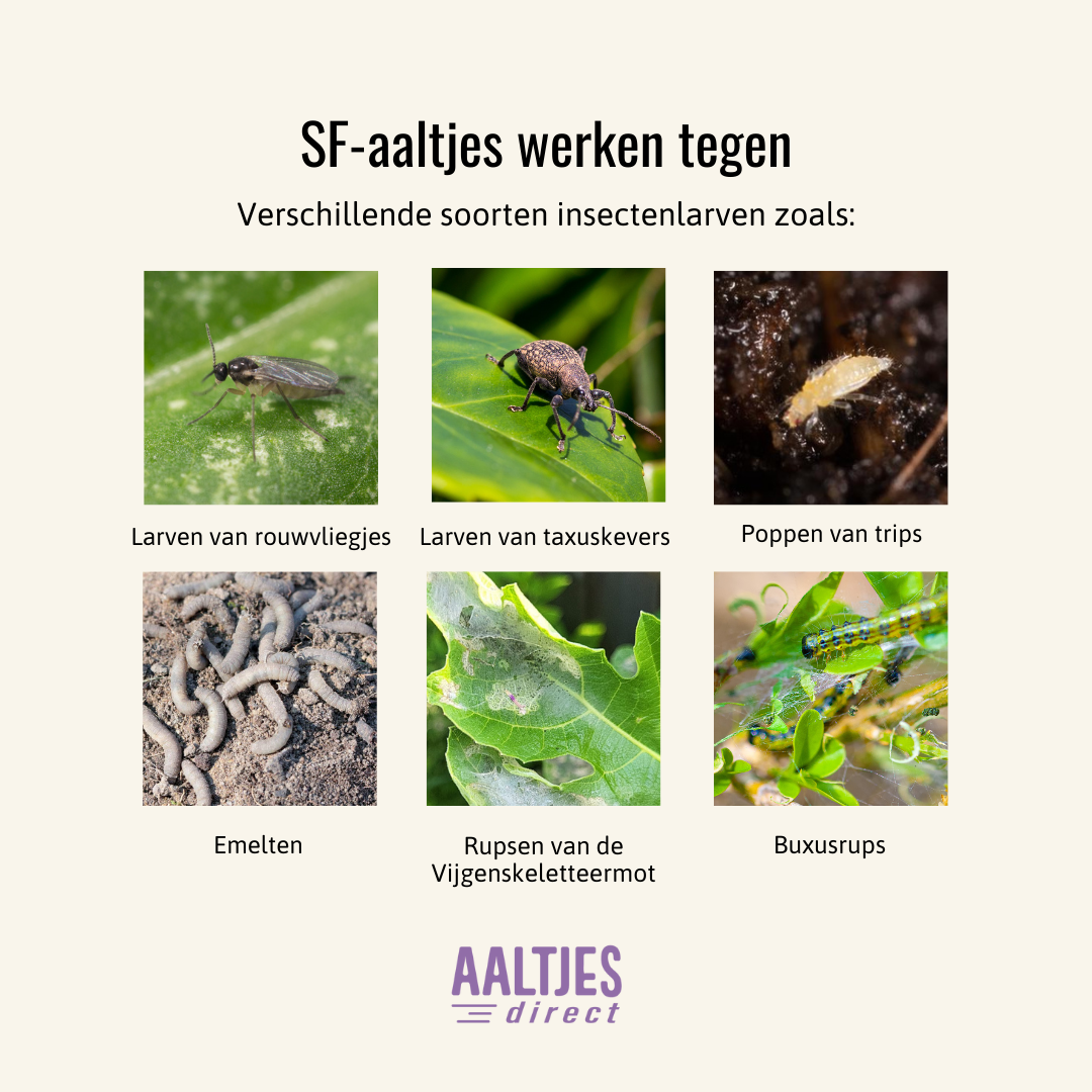 Aaltjes (nematoden) zijn microscopisch kleine wormpjes die van nature in de bodem voorkomen en helpen bij het bestrijden van bepaalde insectenplagen. Ze dringen de plaag binnen en doden de plaag van binnenuit.